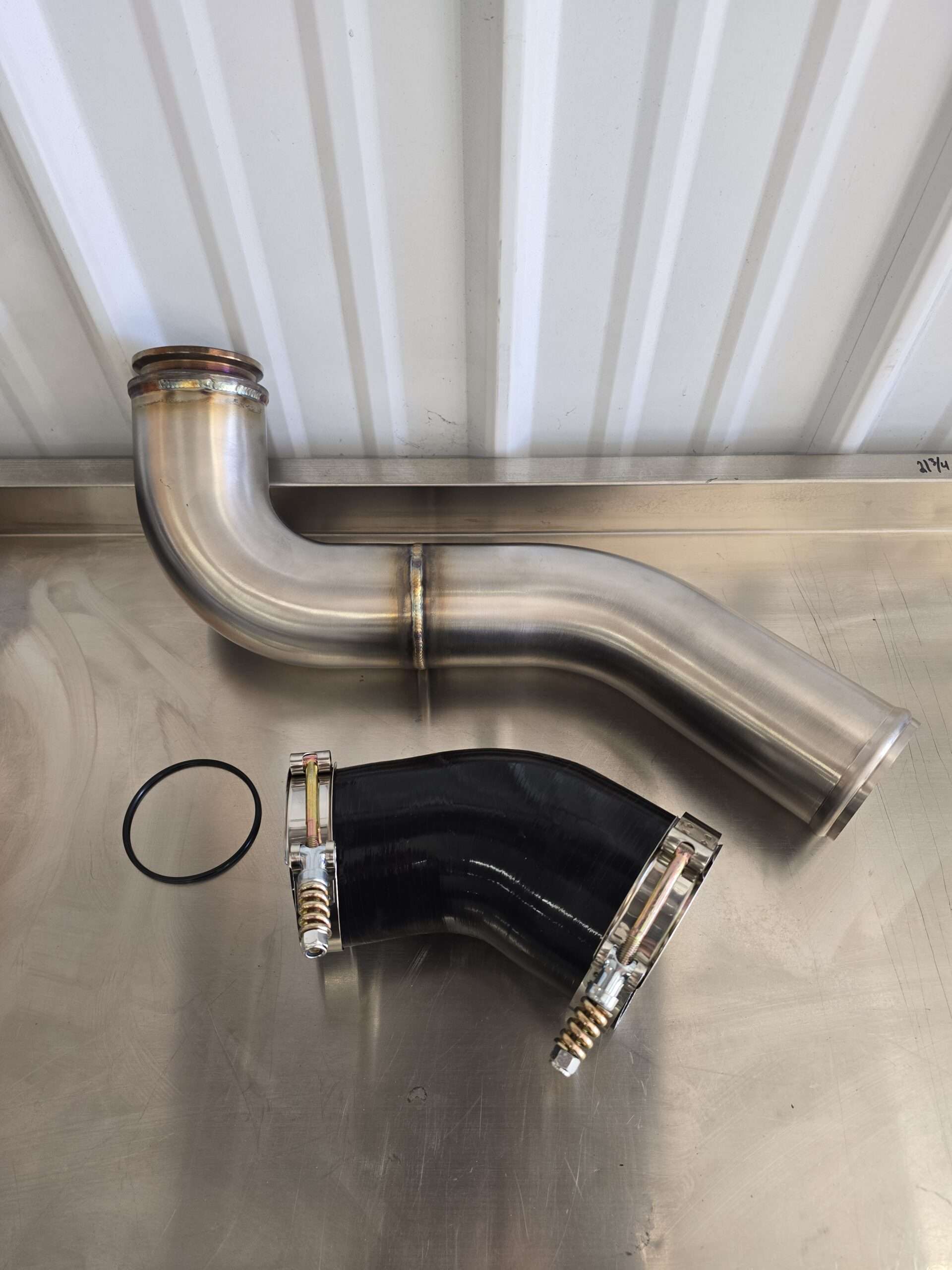 Stainless steel with O-ringed V-band flange hot charge pipe. Fits 94-02 5.9 12V/24V Cummins with factory intercooler or 3.5″ inlet intercooler only. Low mount style 1 piece intercooler pipe (which is factory/oe fitment) for stock or modified hx35 or direct drop in s300 replacement charger with SXE v-band cover only! Deletes factory cast elbow and boot at the Turbocharger. Comes with intercooler boot and clamps and new Oring.