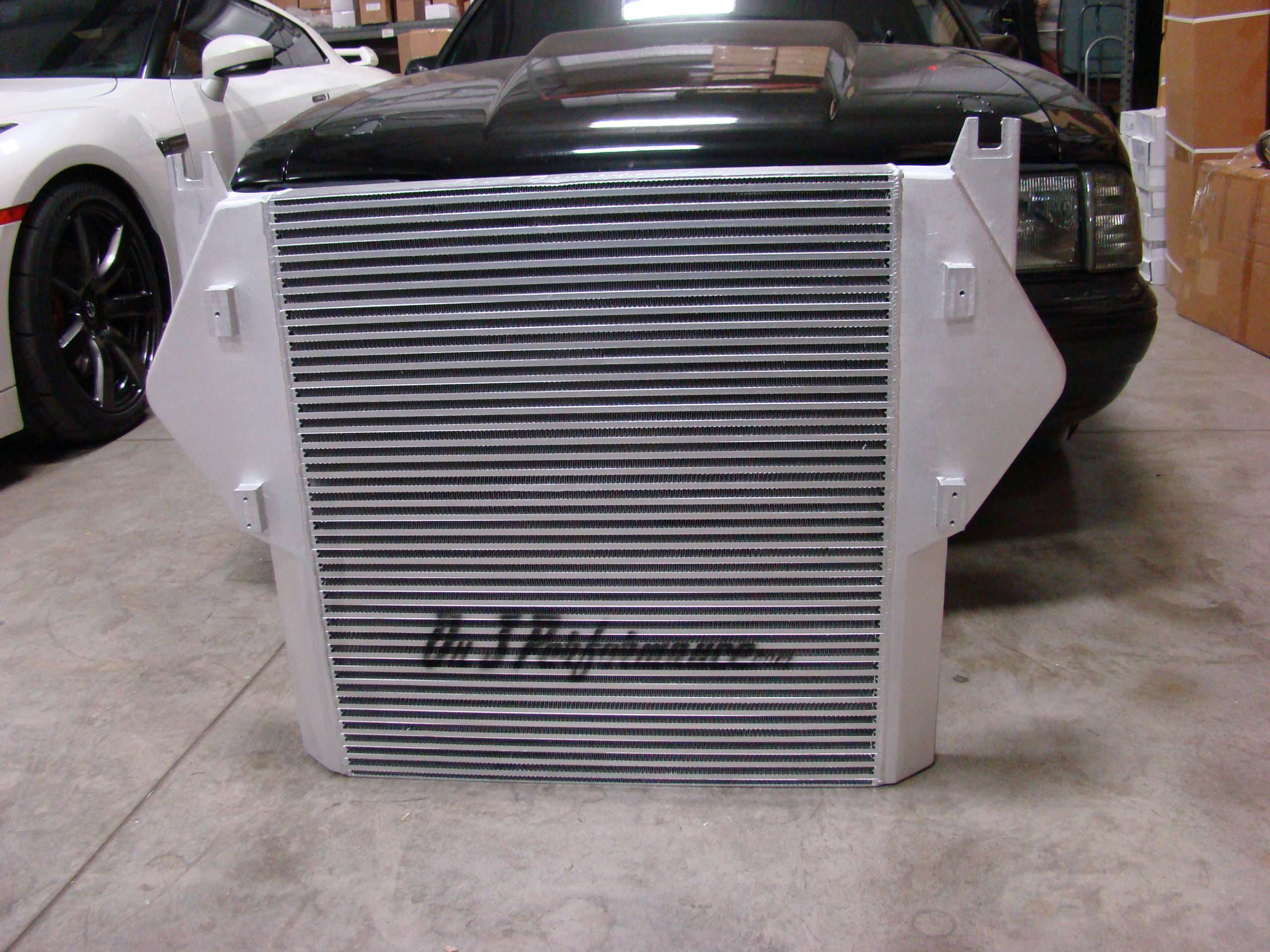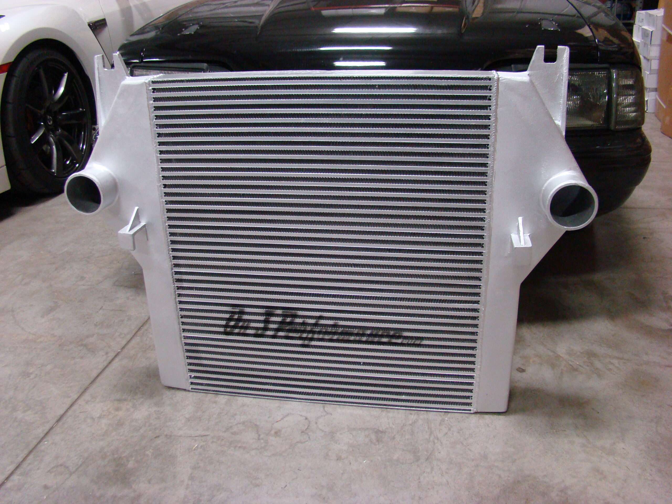 On3 intercooler 26″ wide 28.5″ tall 3 1/8″ thick core and larger end tanks.