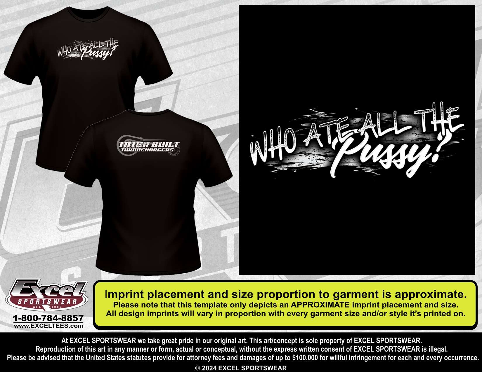 Tater Built Turbochargers Branded Funny T-Shirt: Gilden high quality shirts! Tater built Turbochargers on the rear and Who Ate All The Pussy on the front. we are doing these funny shirts because they are a hit at the truck shows and makes a good laugh. Nothing personal LOL